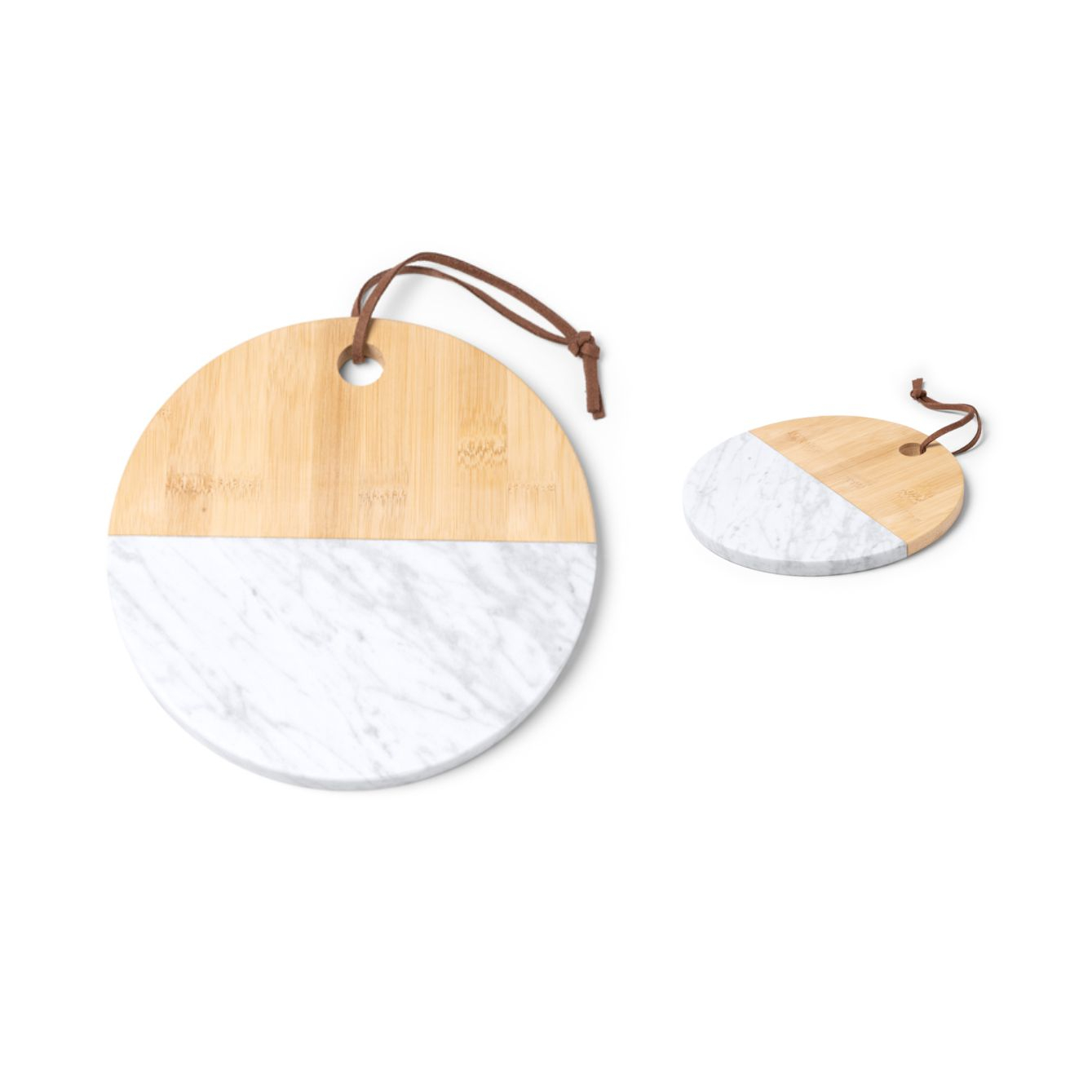Tagliere in marmo e bamboo naturale. Cinghia da trasporto in similpelle inclusa. Confezione in scatola di design ecologico. Dimensioni: cm 1,2x20Ø