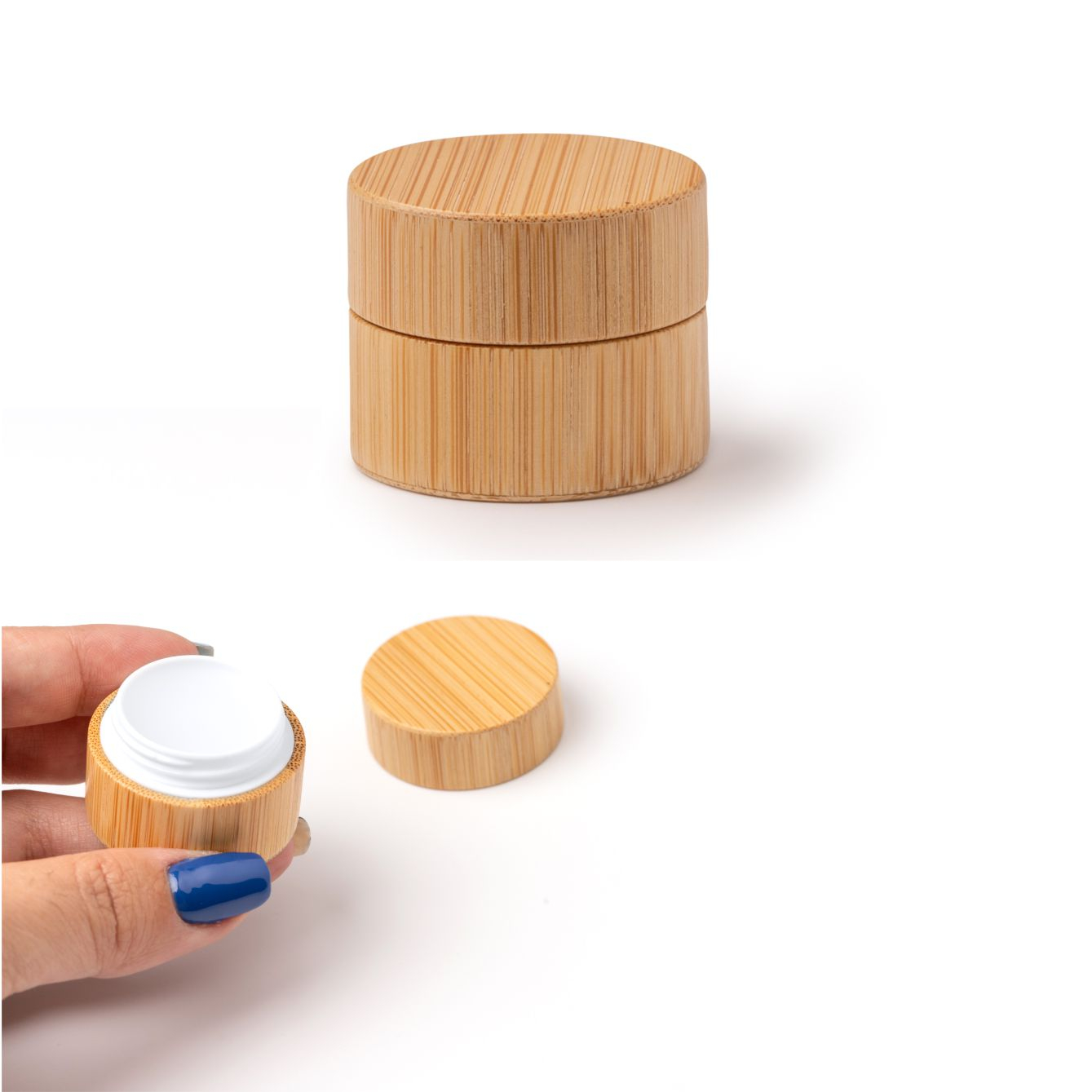 Balsamo per labbra in un astuccio di bamboo. Protezione SPF15. Dimensioni: cm 3x3,8Ø