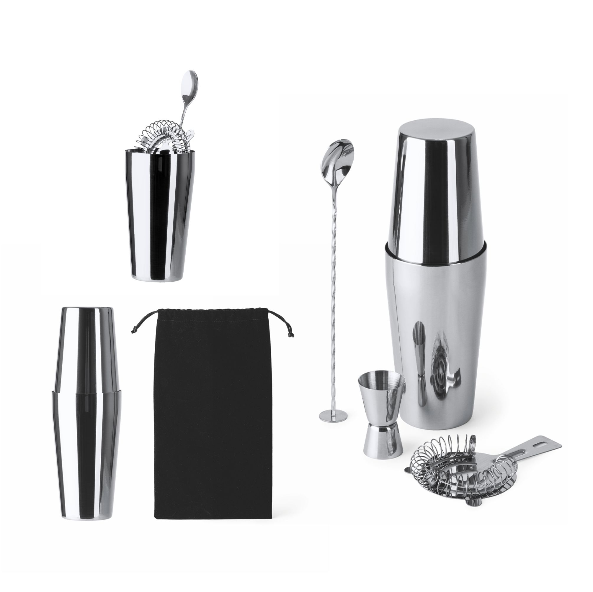 Set da cocktail in acciaio inossidabile 304. Accessori inclusi: misurino, shaker da 580 ml, colino e agitatore. Confezione in astuccio. Custodia da trasporto inclusa. Dimensioni: cm 29,5x8,7. Imballo: 20pz.