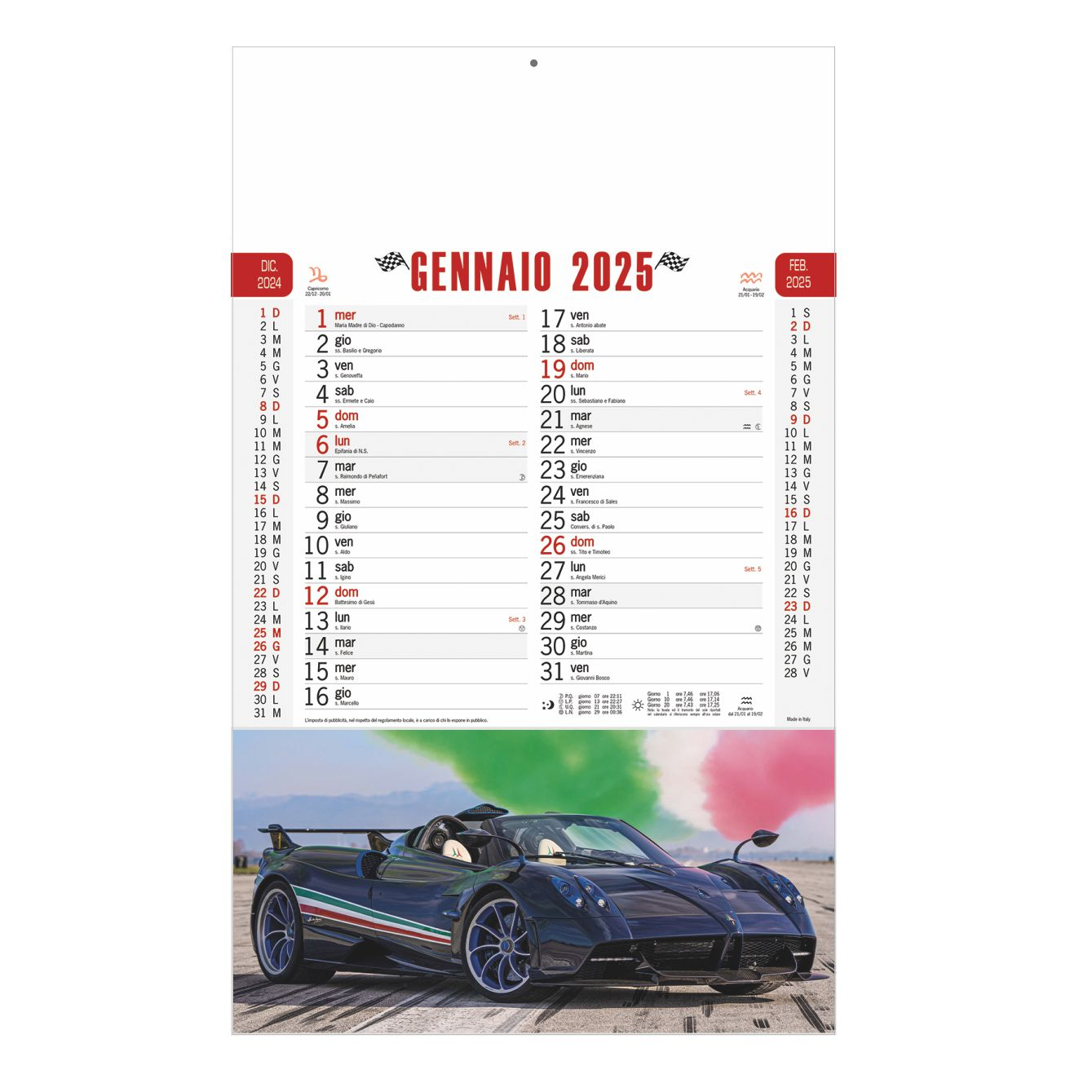 Calendario “ Auto Sportive”. Trimestrale 12 fogli. Carta patinata. Testata pressofusa. Dimensioni: cm 28,8x47, testata cm 28,8x9. Imballo:100