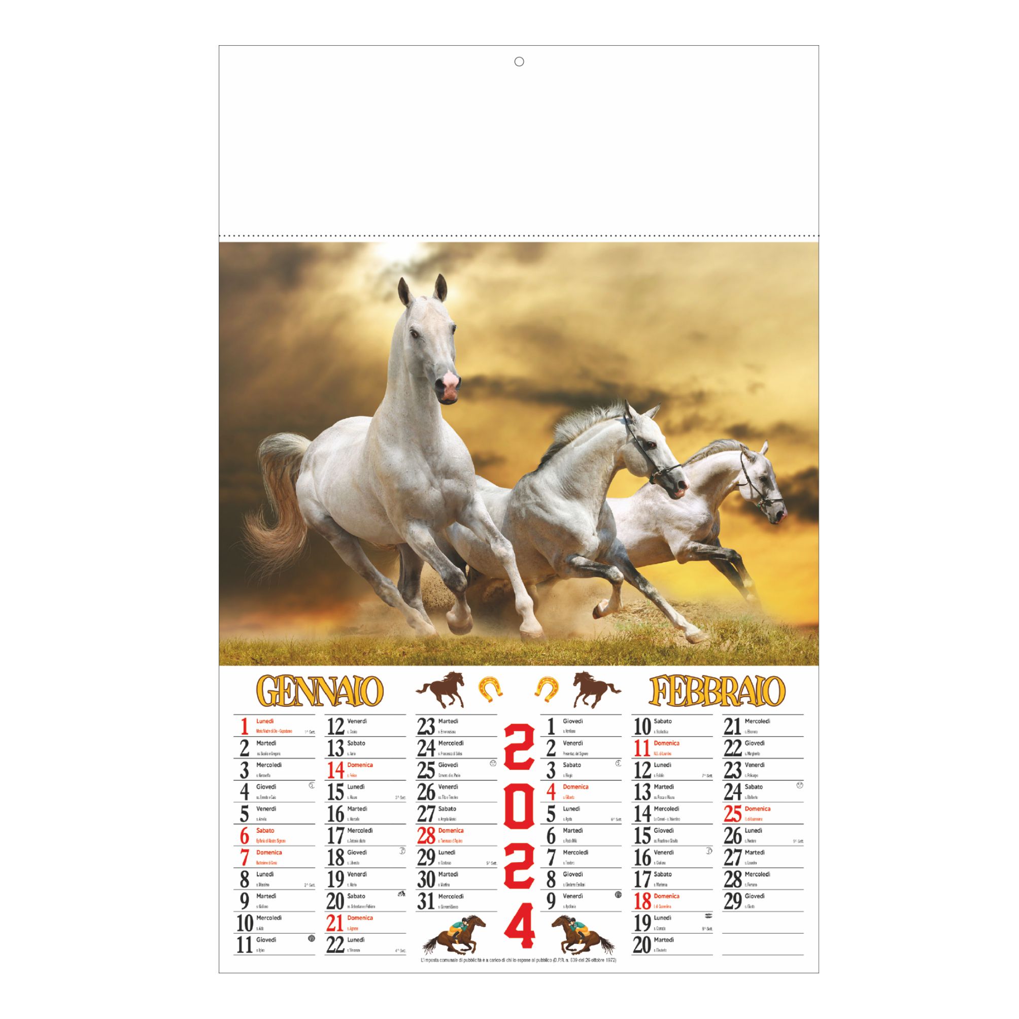 Calendario “Cavalli”. Bimestrale 6 fogli. Carta patinata. Testata pressofusa. Dimensioni: cm 32x49,5, testata cm 32x10. Imballo: 100