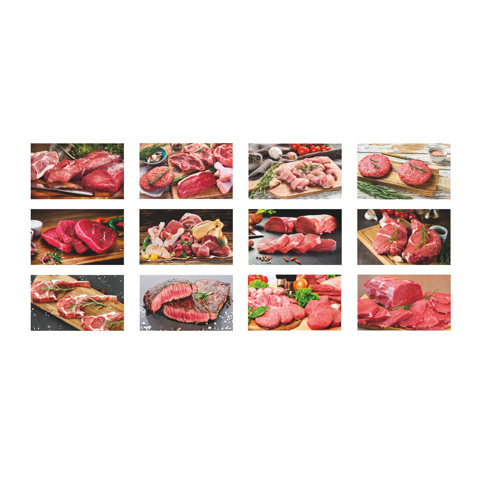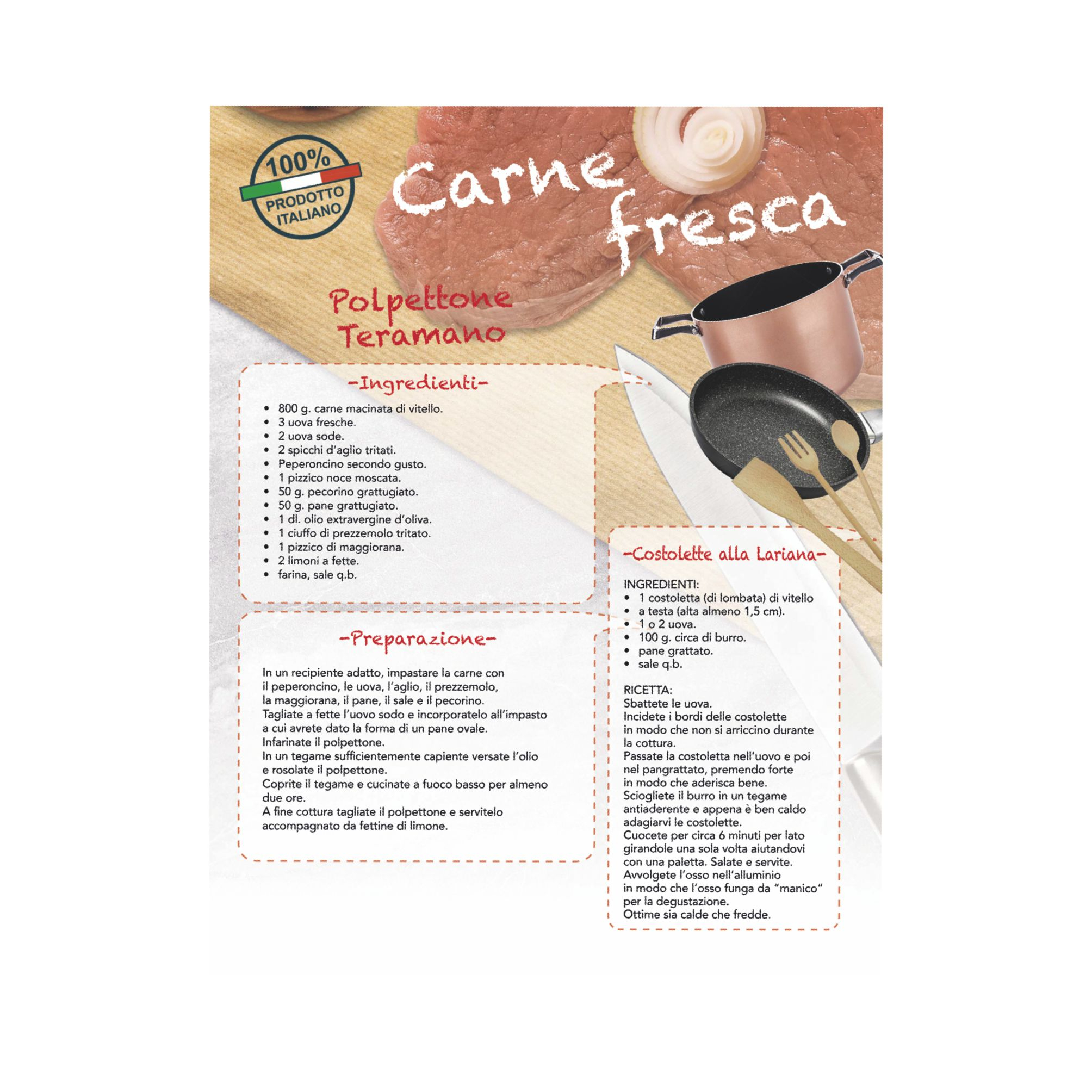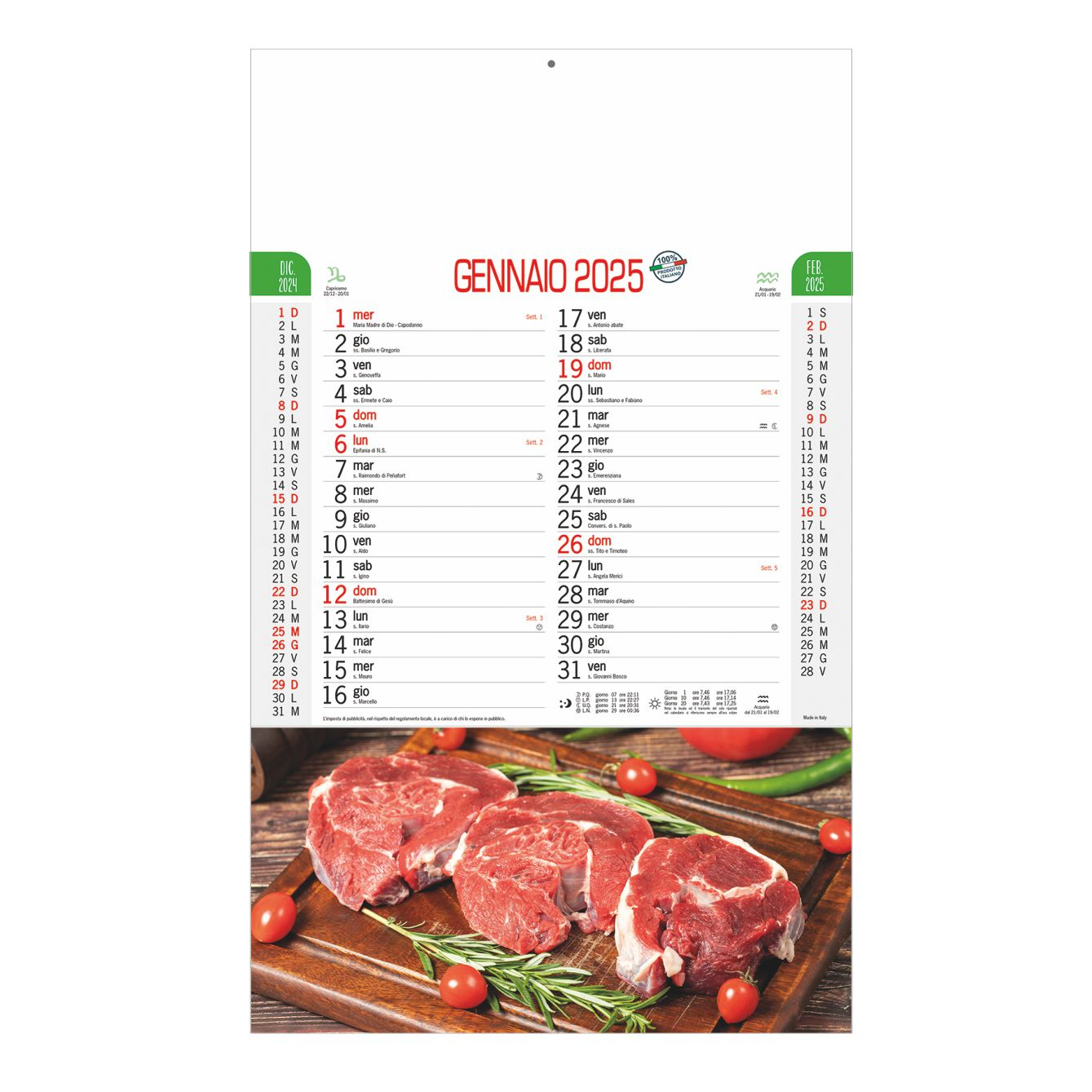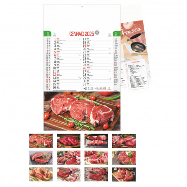 Calendario Carne con ricettario. Trimestrale 12 fogli. Carta patinata. Testata pressofusa. Dimensioni: cm 28,8x47, testata cm 28,8x9. Imballo: 100