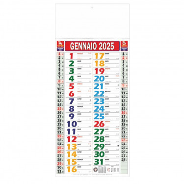 Calendario olandese “Multicolor”. Trimestrale 12 fogli. Testata pressofusa. Dimensioni: cm 22x49, testata cm 22x9. Imballo: 100