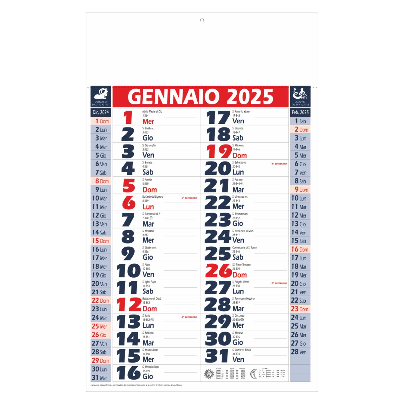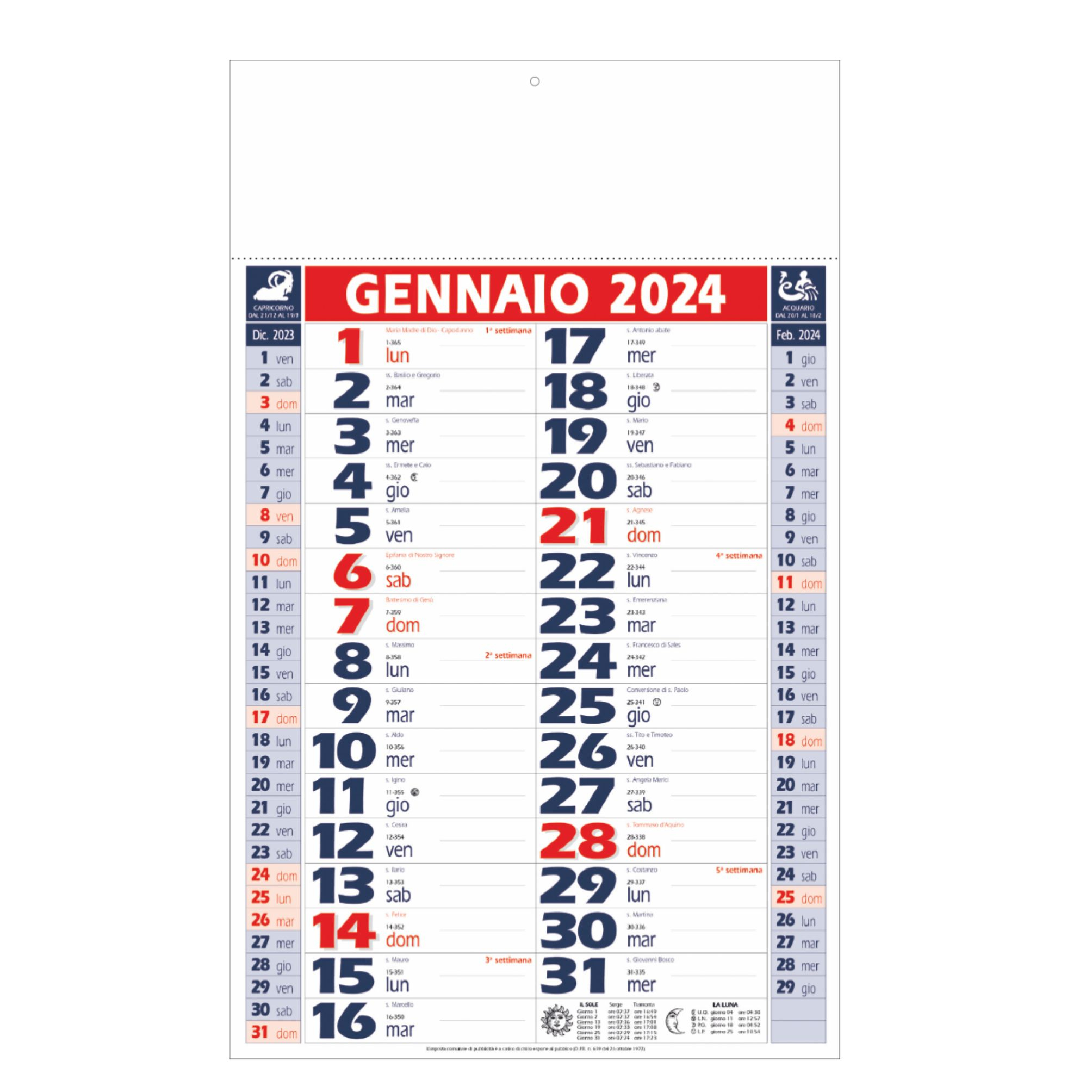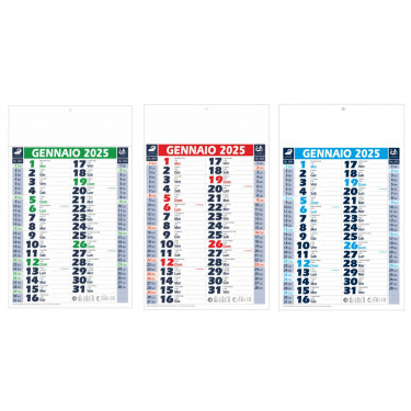 Calendario olandese. Trimestrale 12 fogli. Carta patinata. Testata pressofusa. Colori: verde, rosso, blu. Dimensioni: cm 28,8x47, testata cm 28,8x9,8. Imballo: 100xcolore