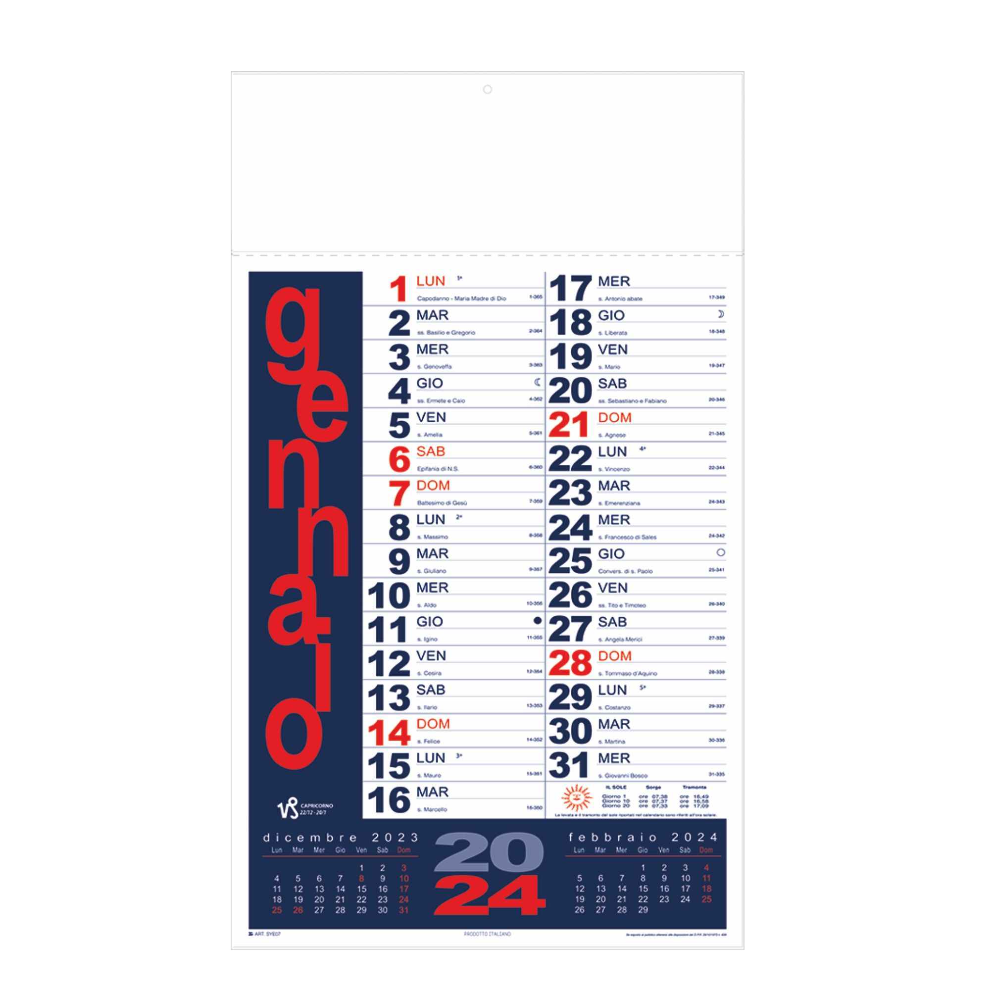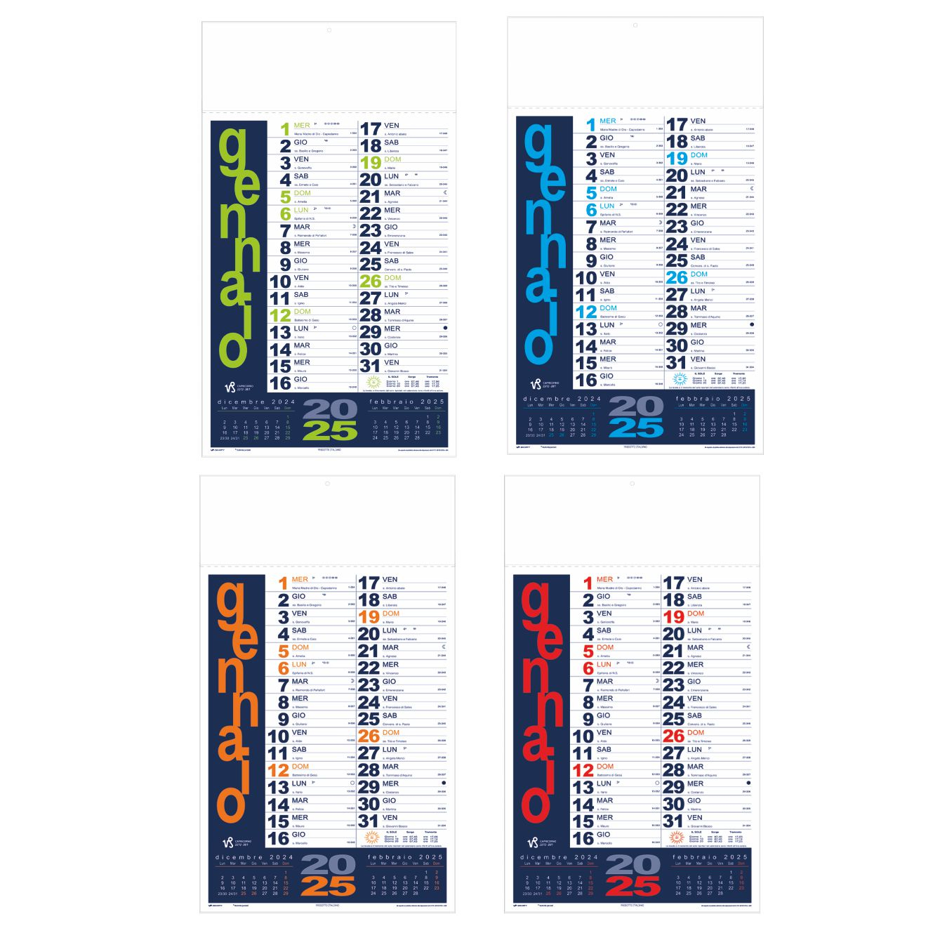 Calendario “Portoghese”. Trimestrale 12 fogli. Carta patinata. Dimensioni: cm 31x53, testata rinforzata cm 31x10.8. Imballo: 100