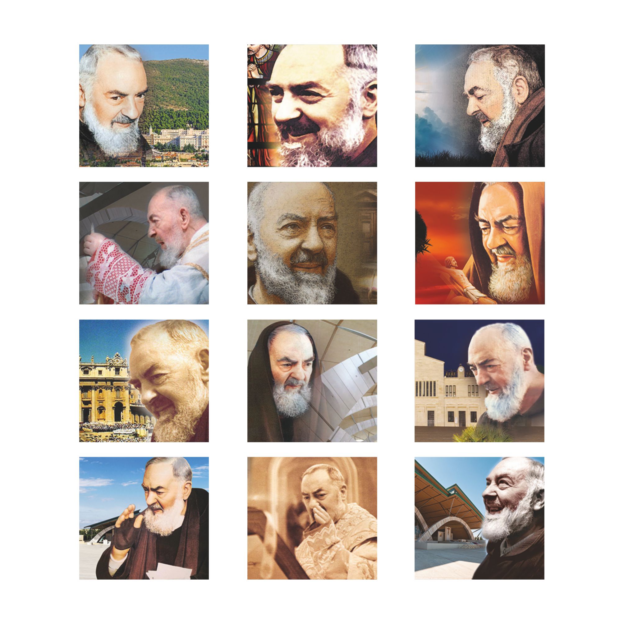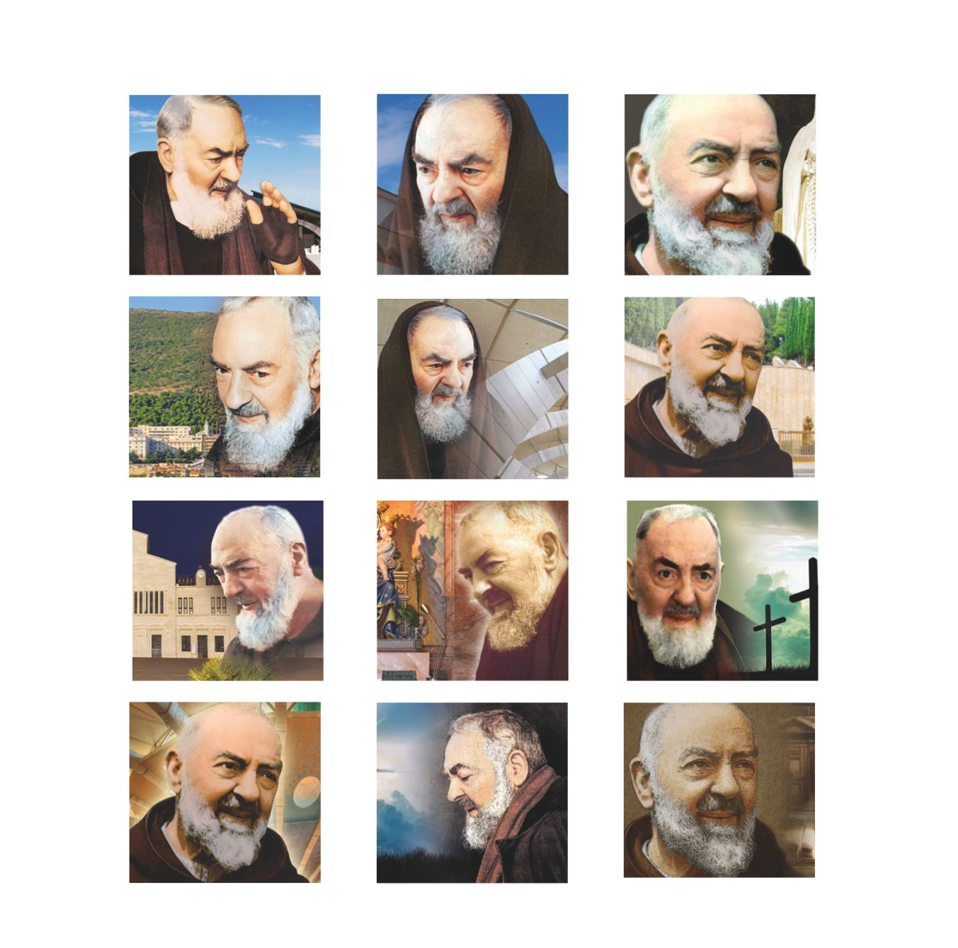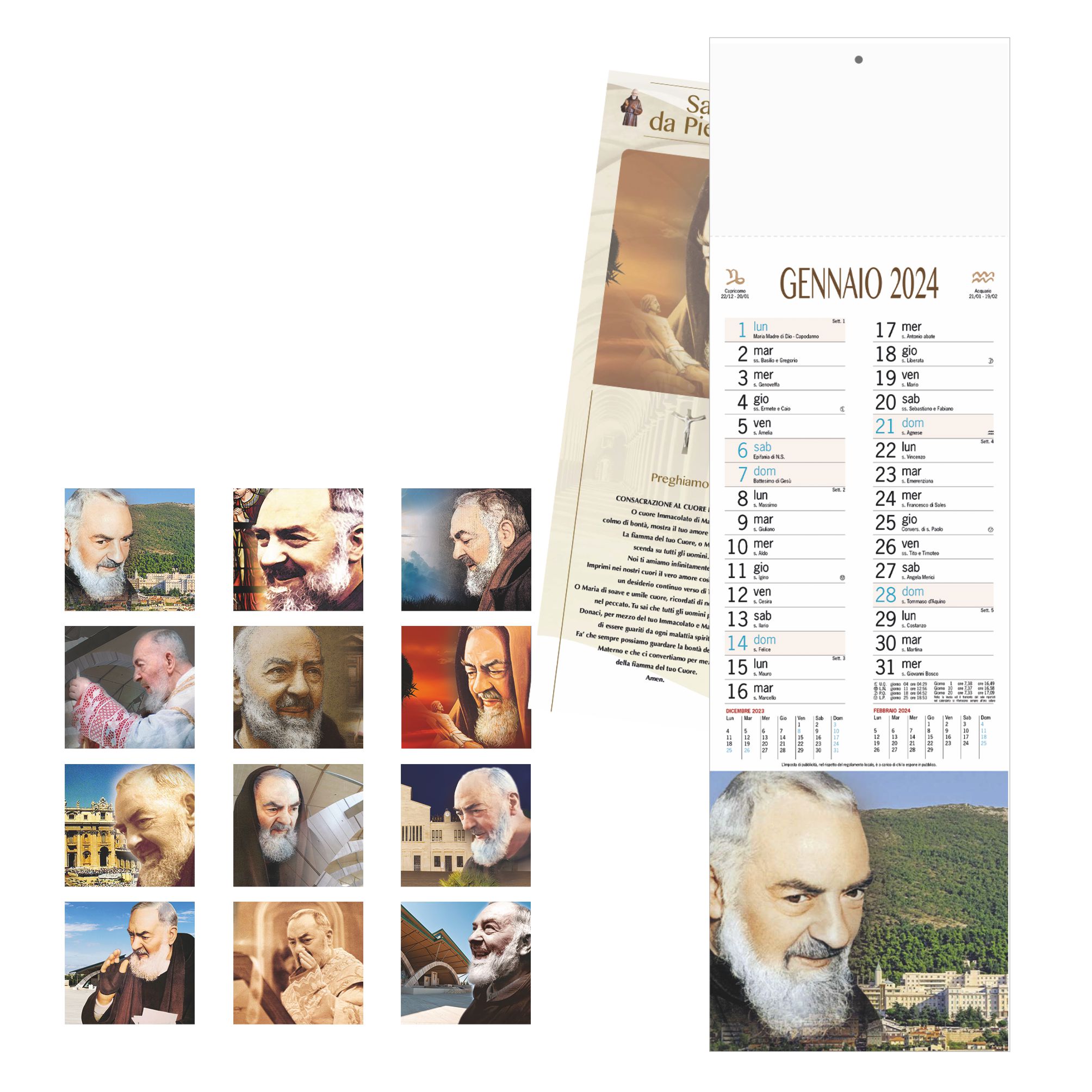 Calendario “San Pio”. Trimestrale 12 fogli. Testata pressofusa. Carta patinata. Dimensioni: cm 14x47, testata cm 14x9. Imballo: 100pz