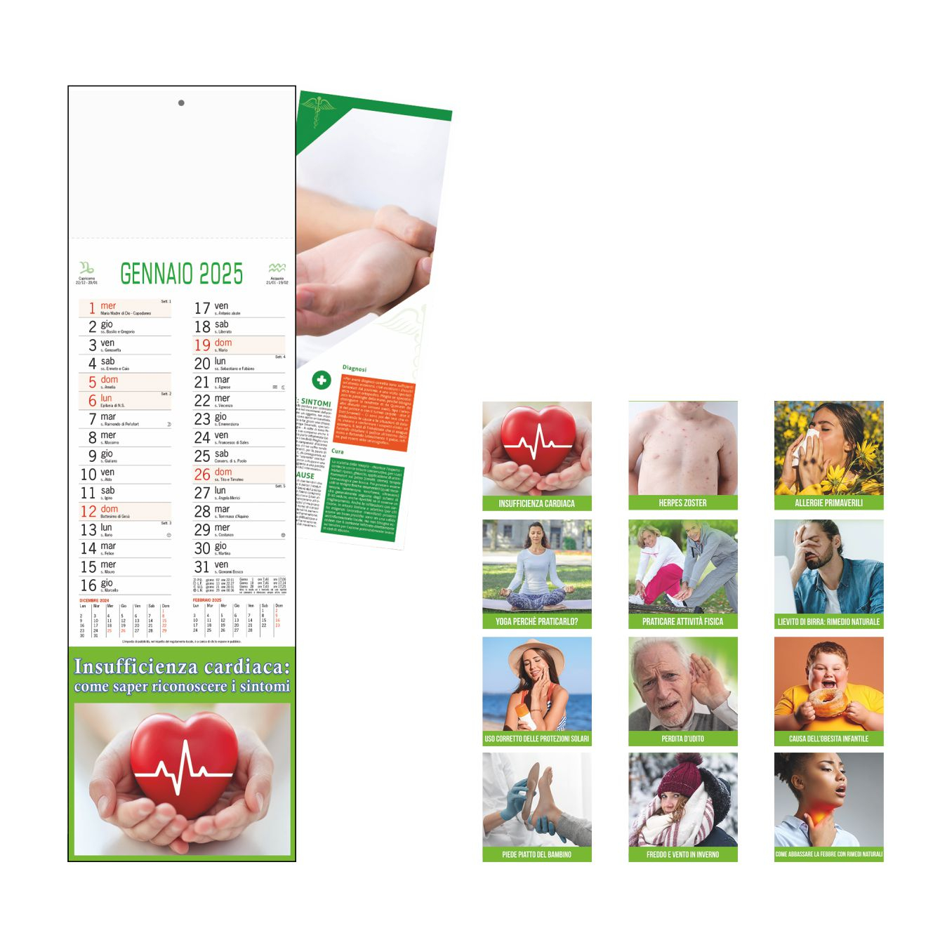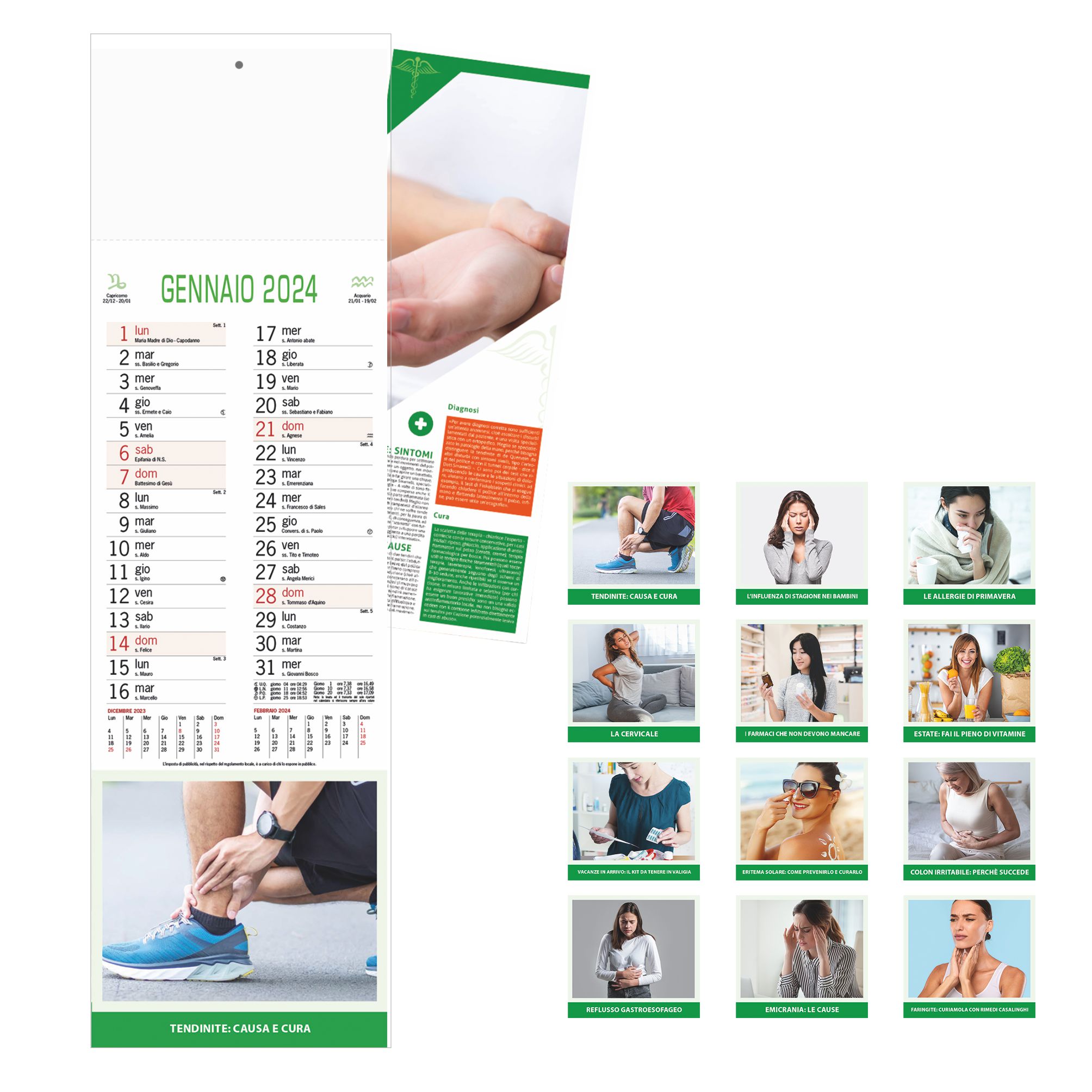 Calendario Consigli del Farmacista Trimestrale 12 fogli. Carta patinata. Dimensioni: cm 14x47, testata cm 14x9. Imballo: 100pz