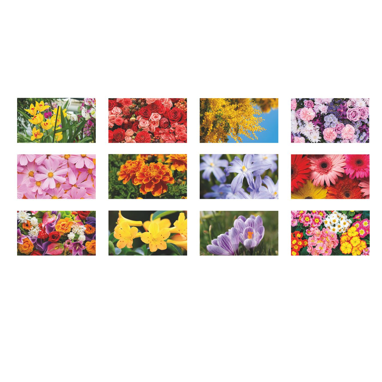 Calendario “Fiori”. Trimestrale 12 fogli. Carta patinata. Testata pressofusa. Dimensioni: cm 28,8x47, testata cm 28,8x9. Imballo: 100