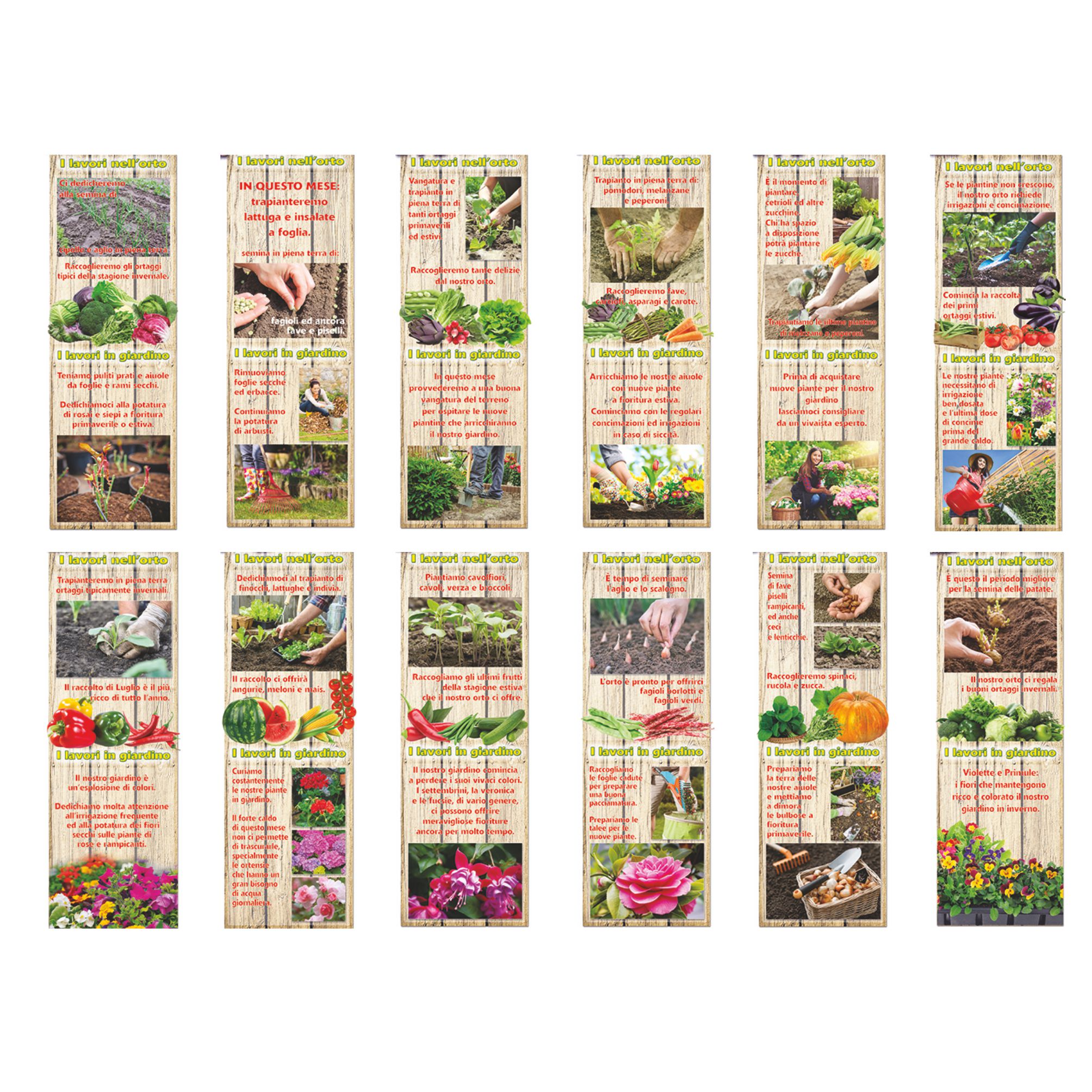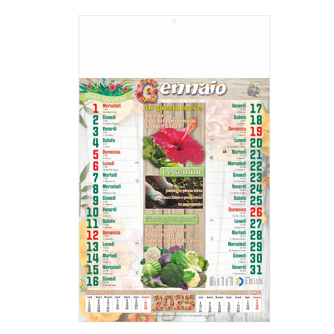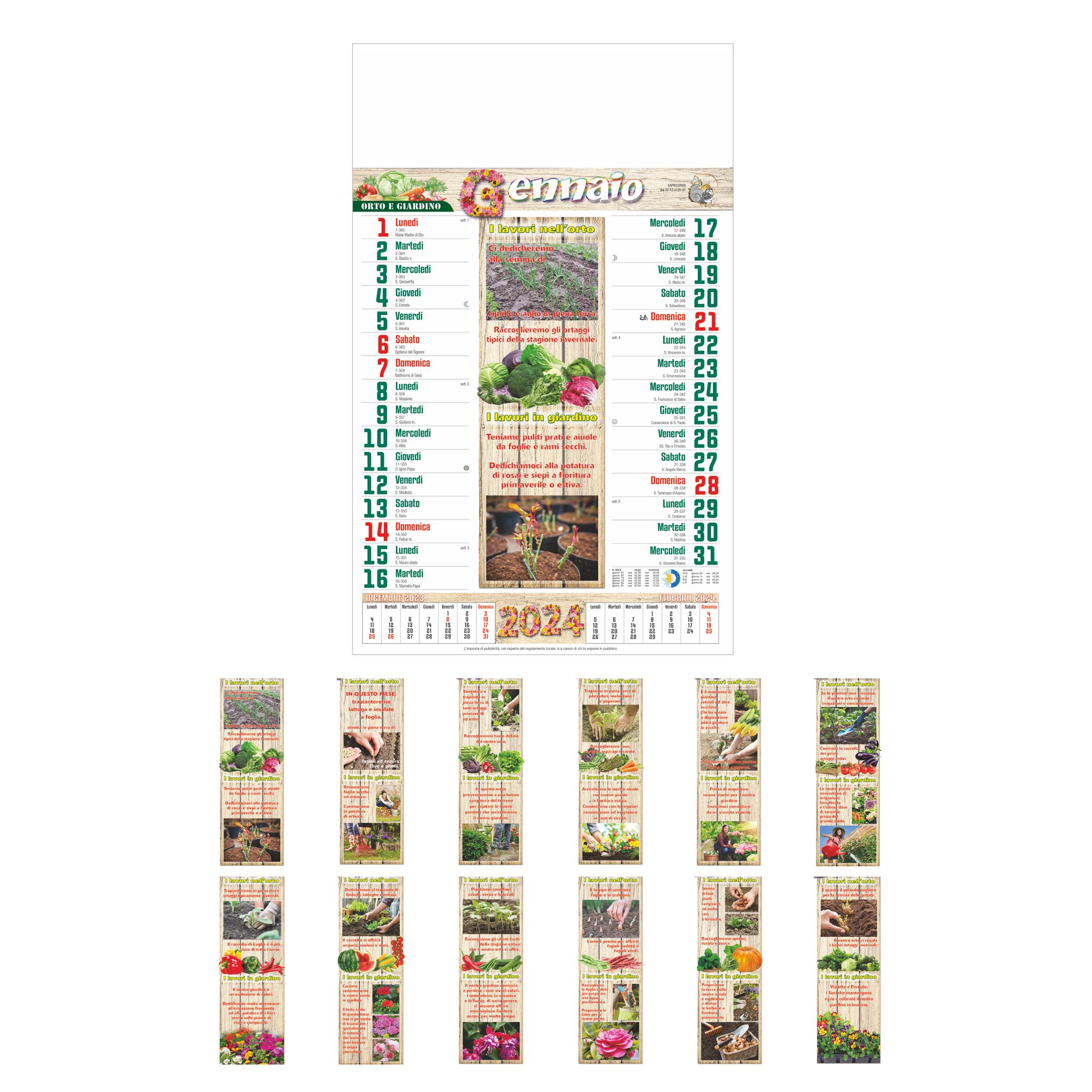 Calendario “Orto e Giardino. Trimestrale 12 fogli. Carta patinata. Testata pressofusa. Dimensioni: cm 28,8x47, testata cm 28,8x9. Imballo: 100