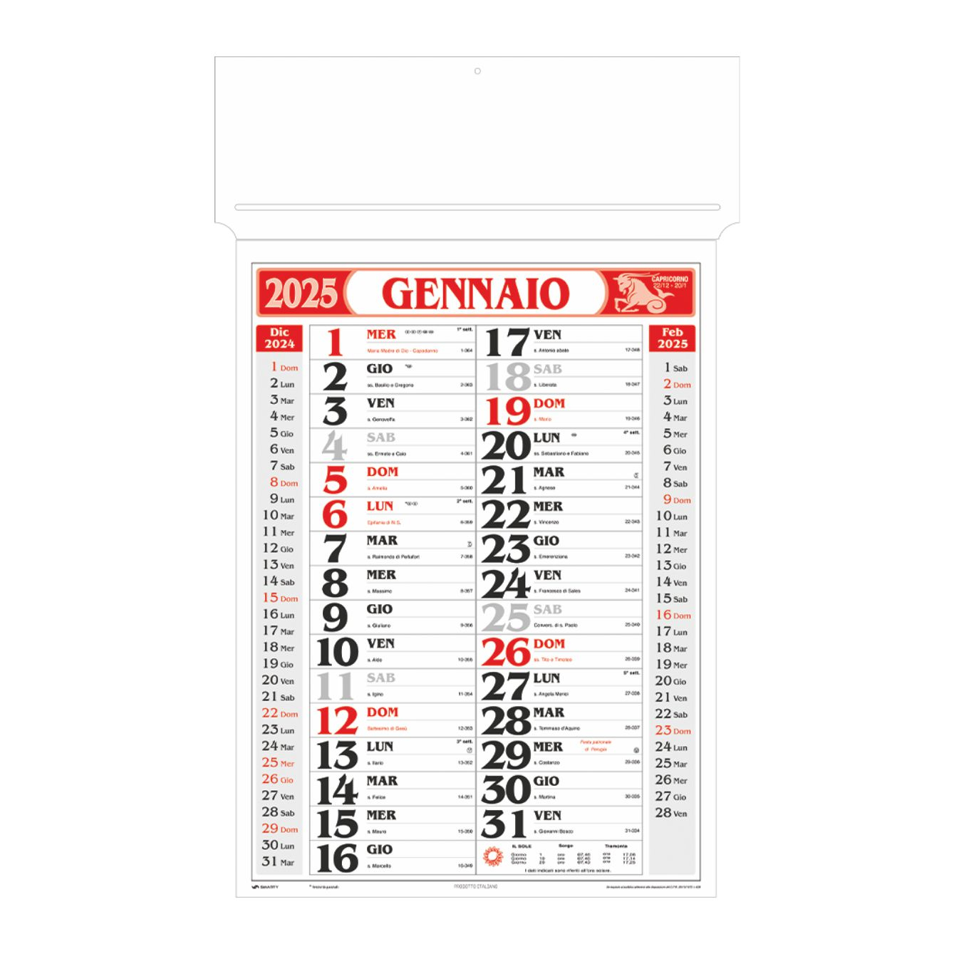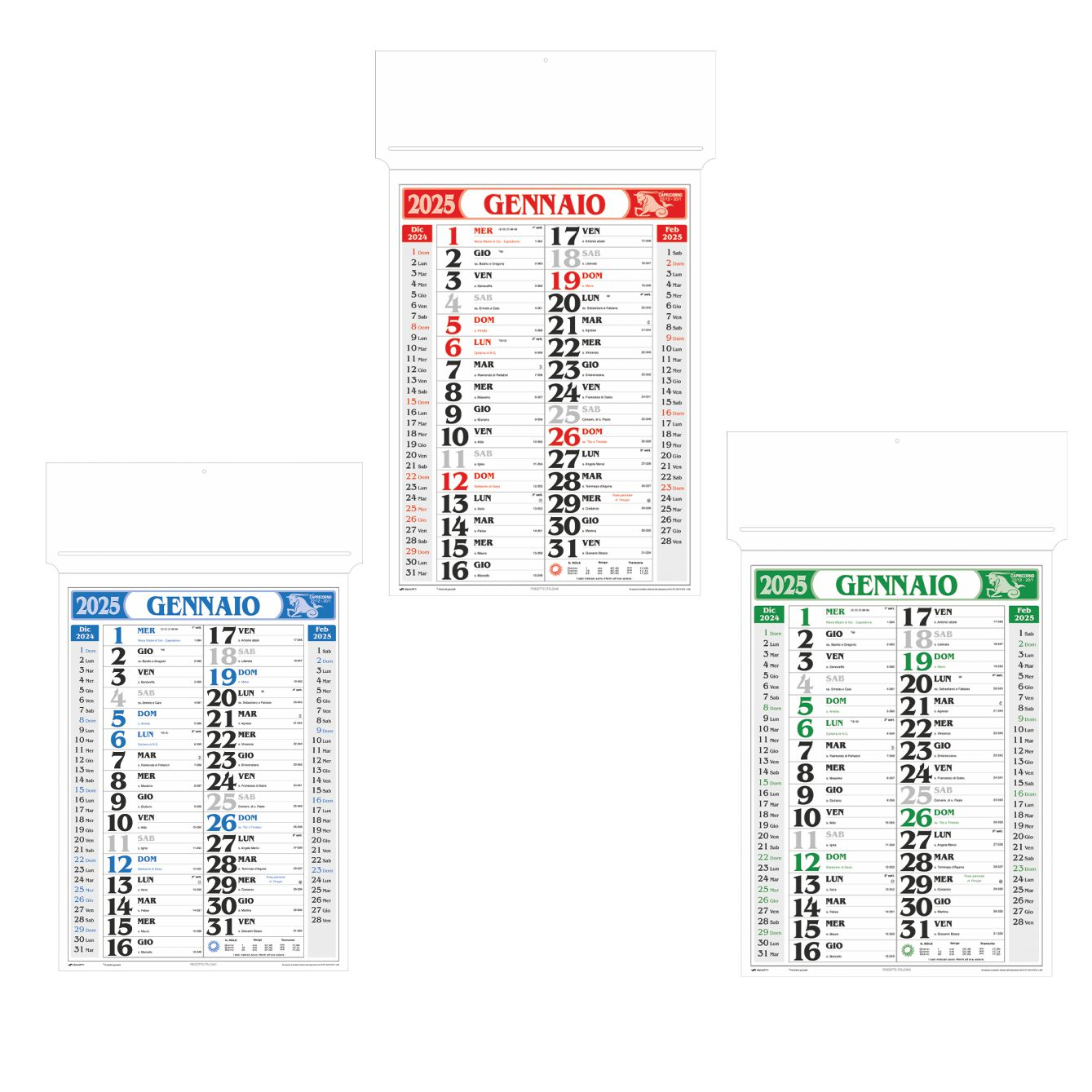 Calendario olandese passafoglio. Trimestrale 12 fogli. Colori: rosso, blu, verde. Dimensioni: cm 34x55, testata rinforzata cm 34x9.5. Imballo: 100xcolore