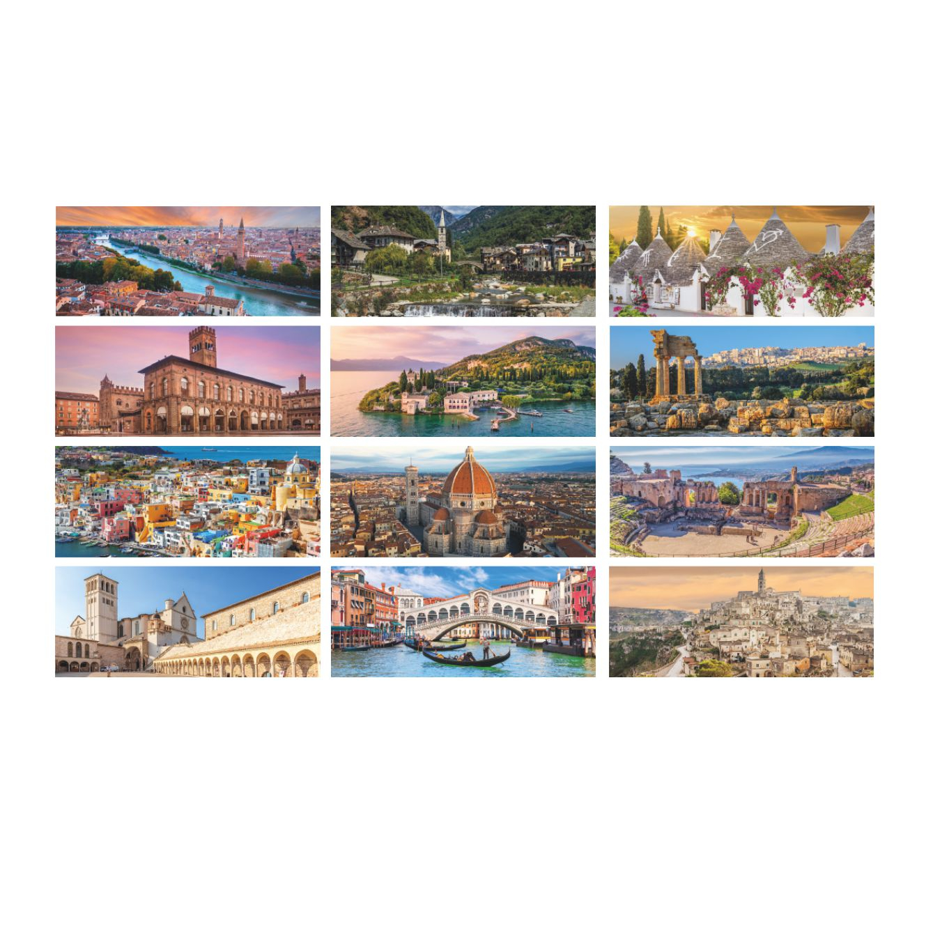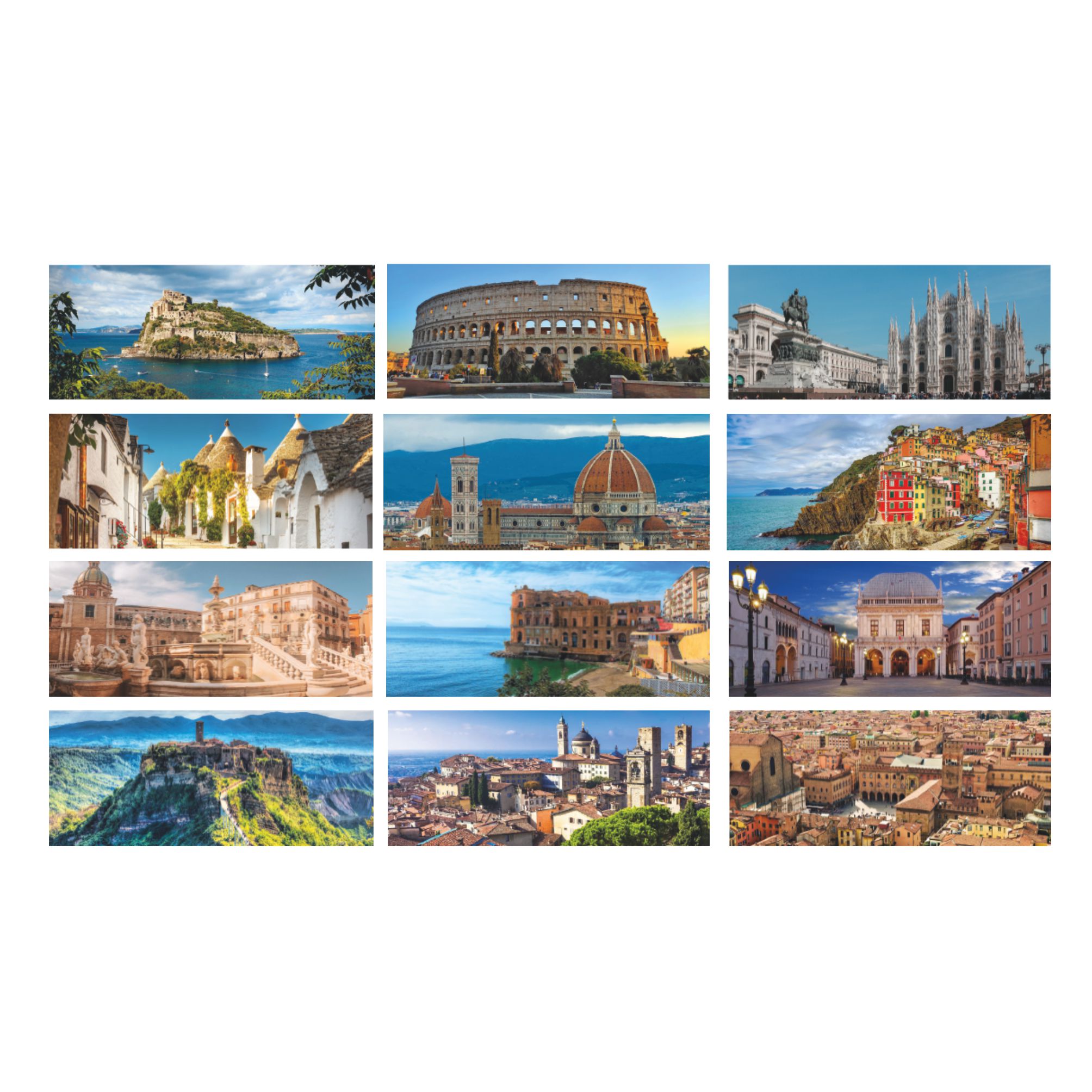 Calendario “Paesaggi e Città”. Trimestrale 12 fogli cartoncino bianco. Carta patinata. Dimensioni: cm. 19x14,5, piedino cm 19x3,5. Imballo: 100