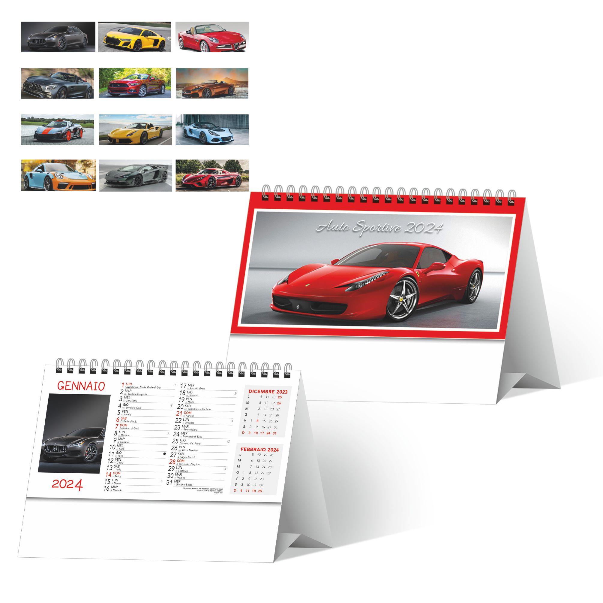 Calendario “Auto Sportive” con spirale. Trimestrale 12 fogli cartoncino bianco. Dimensioni: cm. 19x14,5, piedino 19x3,5. Imballo: 100