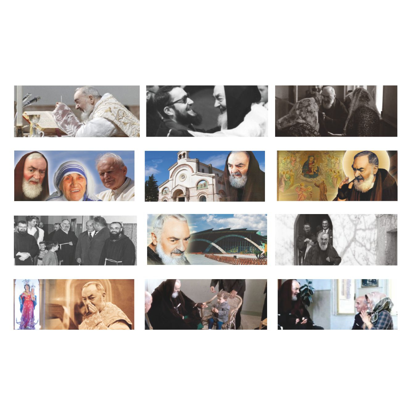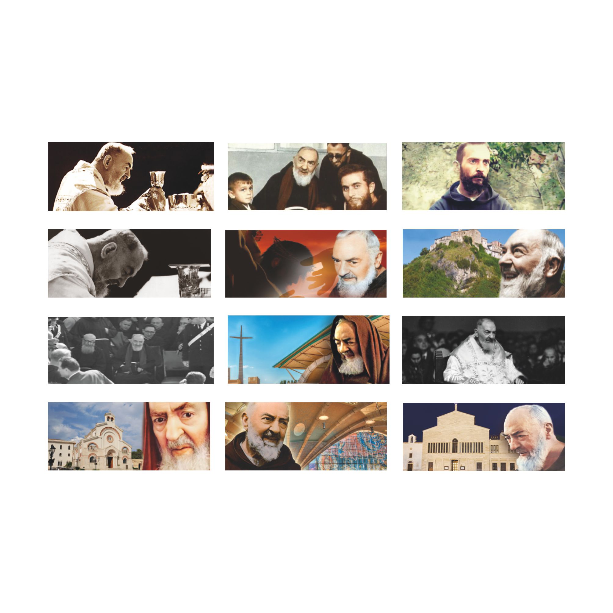 Calendario di Padre Pio carta patinata opaca 100gr, trimestrale 13 fogli. Dimensioni: cm 19x14,5, piedino 19x3,5. Imballo 100pz.