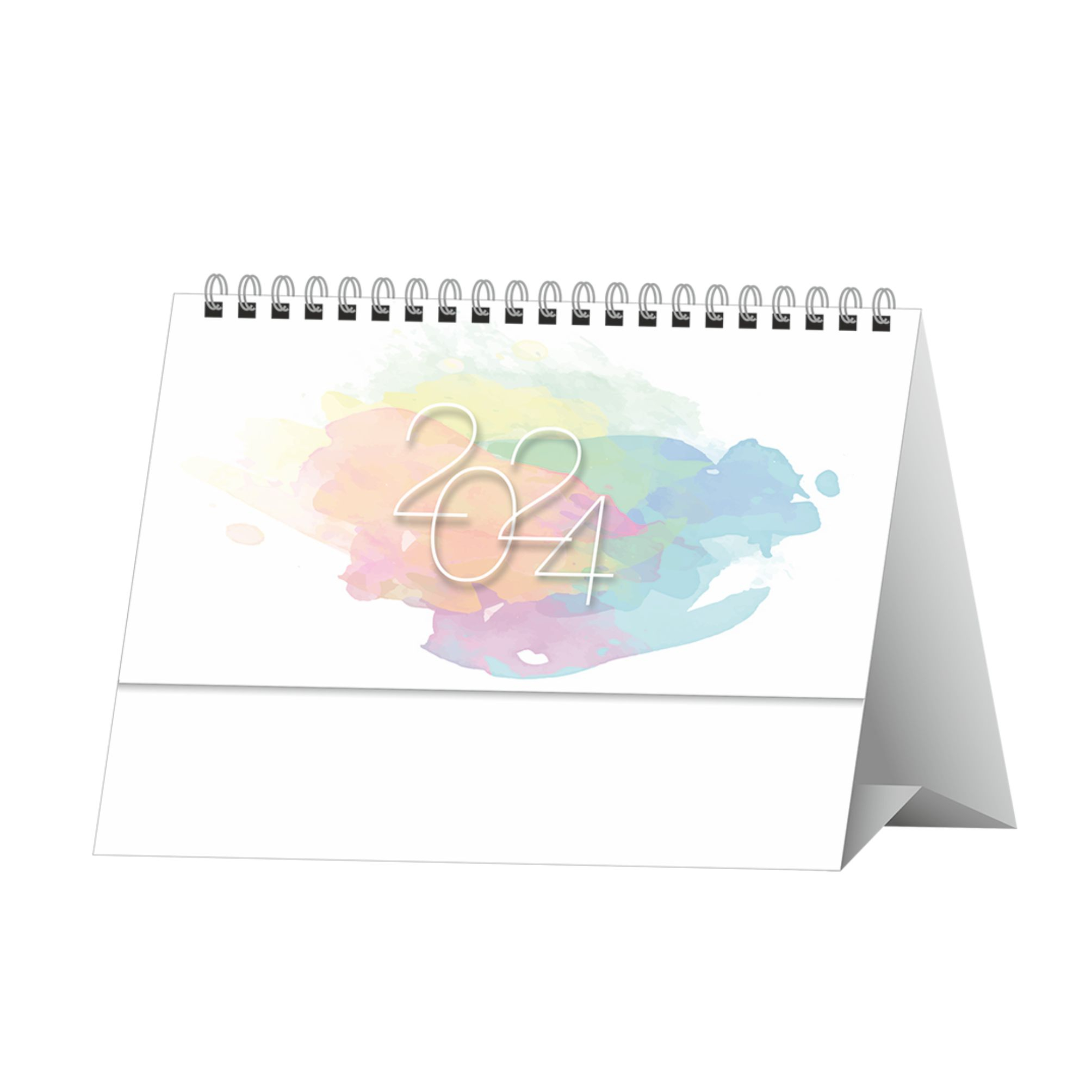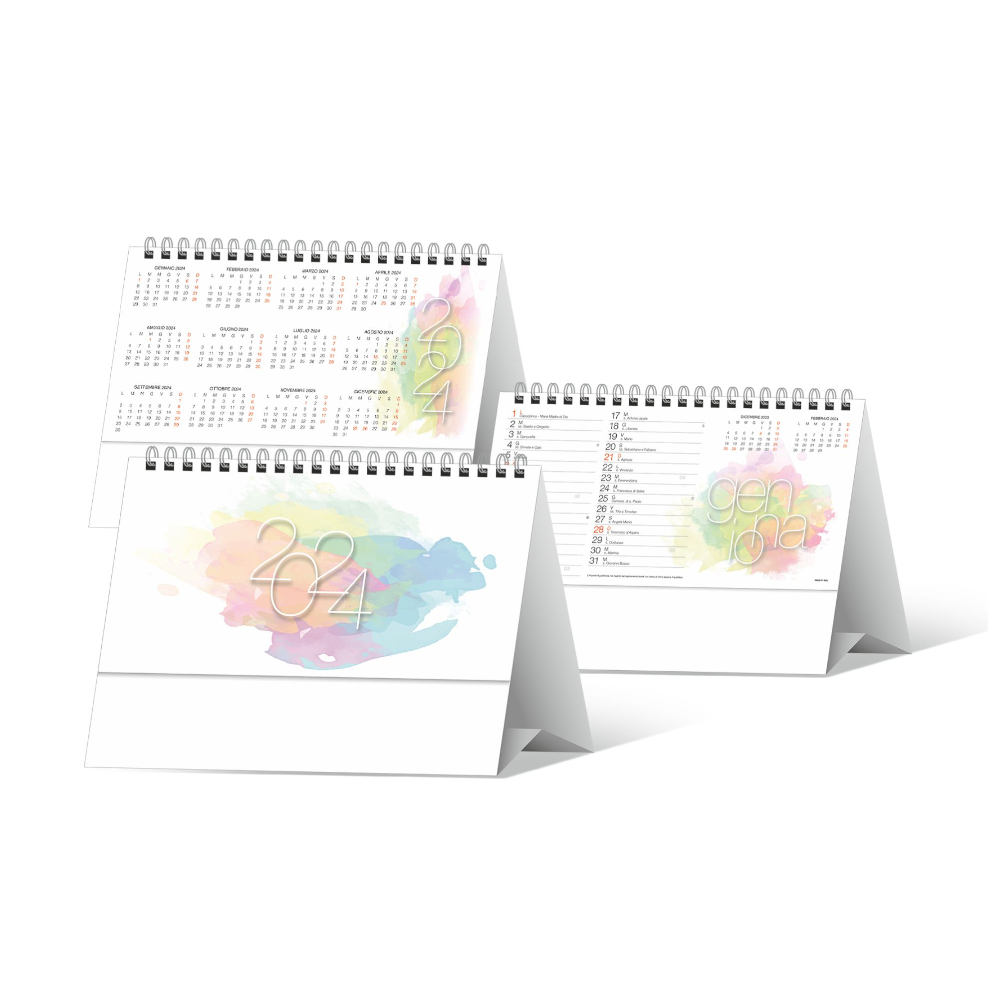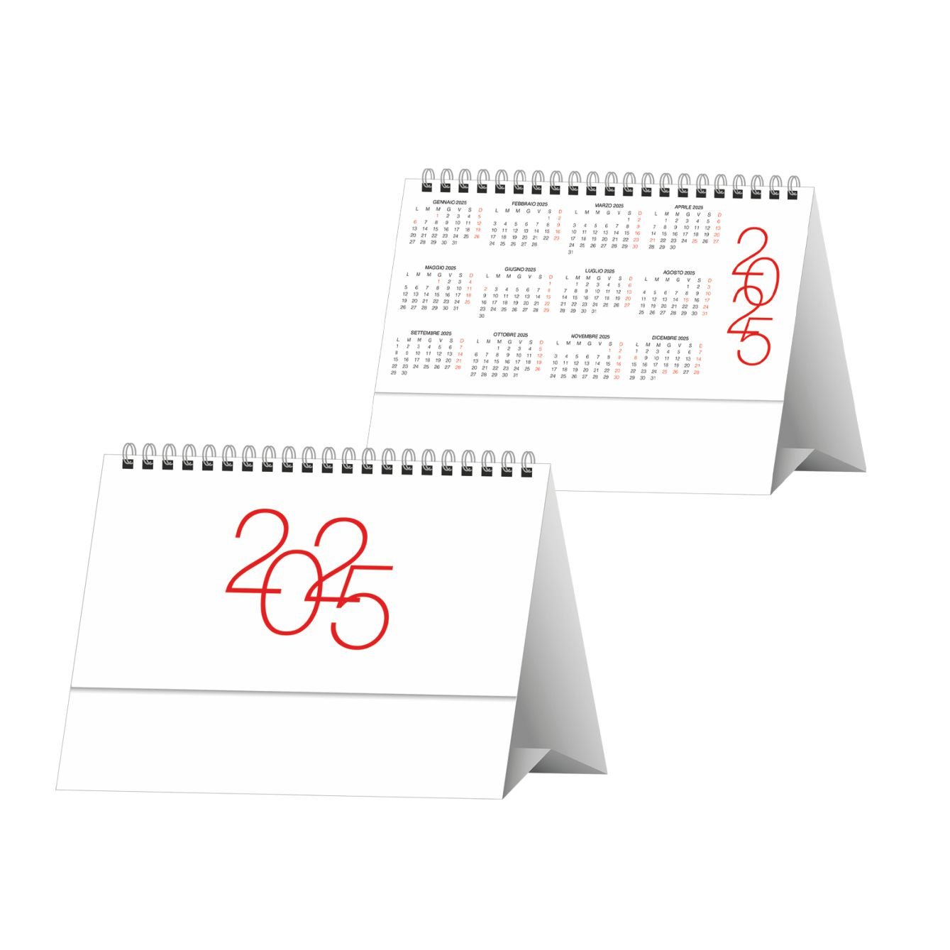 Calendario da tavolo trimestrale 13 fogli in carta patinata opaca 100gr. Dimensioni:cm 19x14,5, piedino cm 19x3,5. Imballo: 100pz.