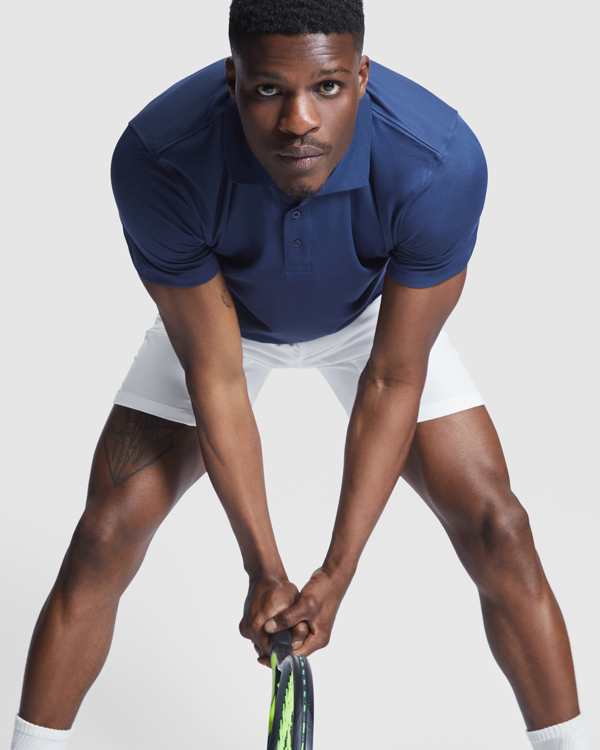 Polo tecnica con manica corta. Collo tricot con chiusura a tre bottoni. Tessuto traspirante facile lavaggio e asciugatura.