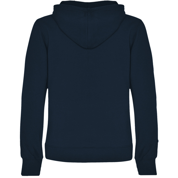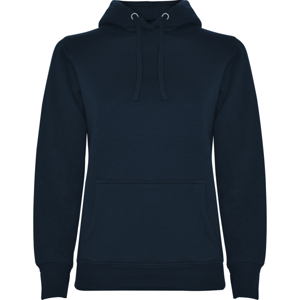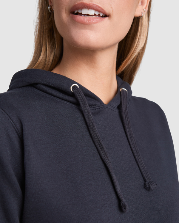 Felpa dal taglio femminile con cappuccio rivestito con tessuto in colore in contrasto e abbinato al cordino e tasca frontale a canguro. Costina con elastan 1x1 su polsini e girovita. Dettaglio apertura - polsino in costina con apertura a occhiello per il pollice.
