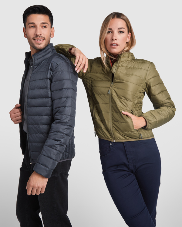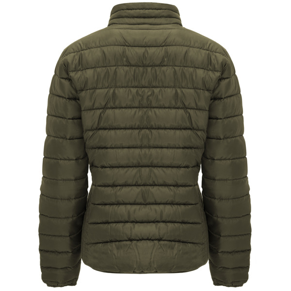 Giubbotto da donna imbottito con ripieno al tatto piuma. 1. Cerniere invertite in tono con protetore per il mento e tiretto. 2. Due tasche frontali con cerniera. 3. Bordo elastico in tono sul collo, polsini e parte inferiore. 4. Fodera interiore in contrasto. 5. Include borsa per il tasporto.