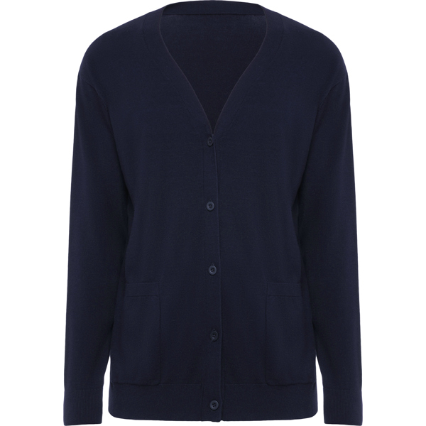 Giacca con collo a V da donna. Tessuto a maglia morbida. Chiusura centrale a cinque bottoni in tono. Due tasche. Polsini e vita elasticizzati in maglia a costine.