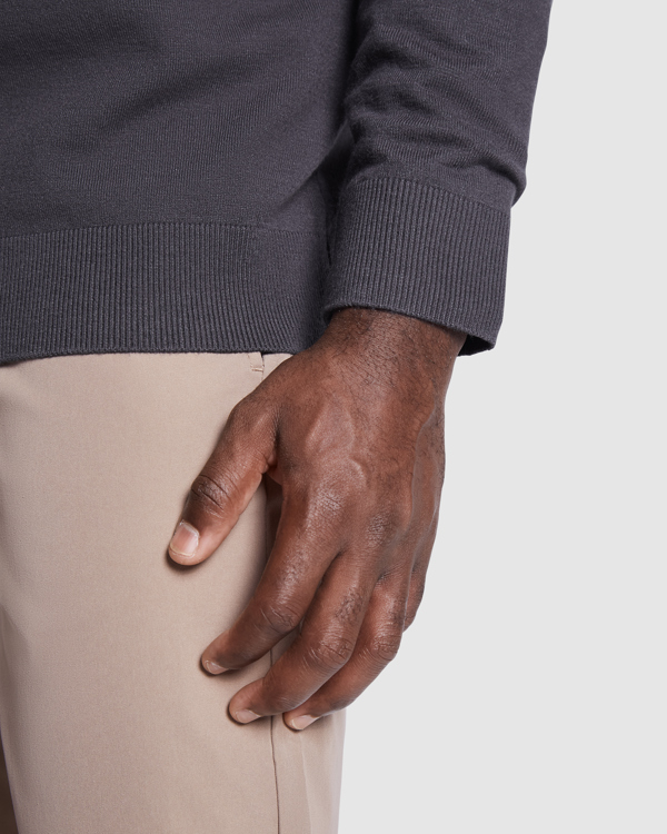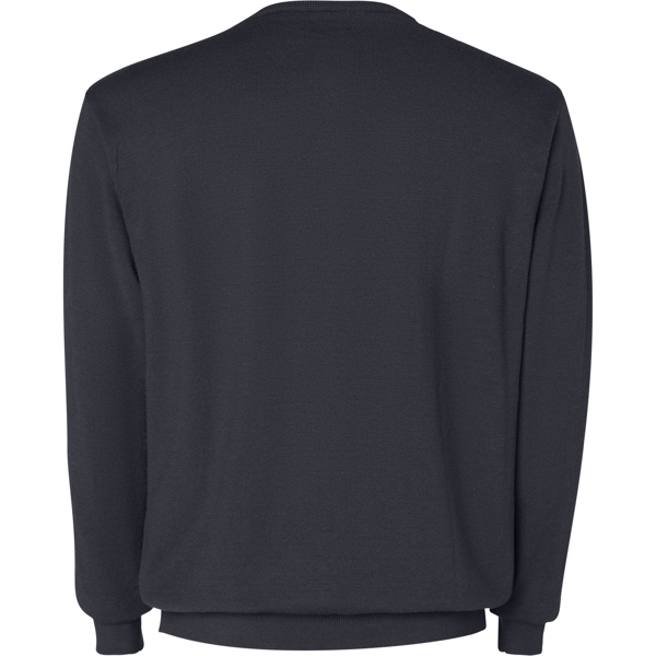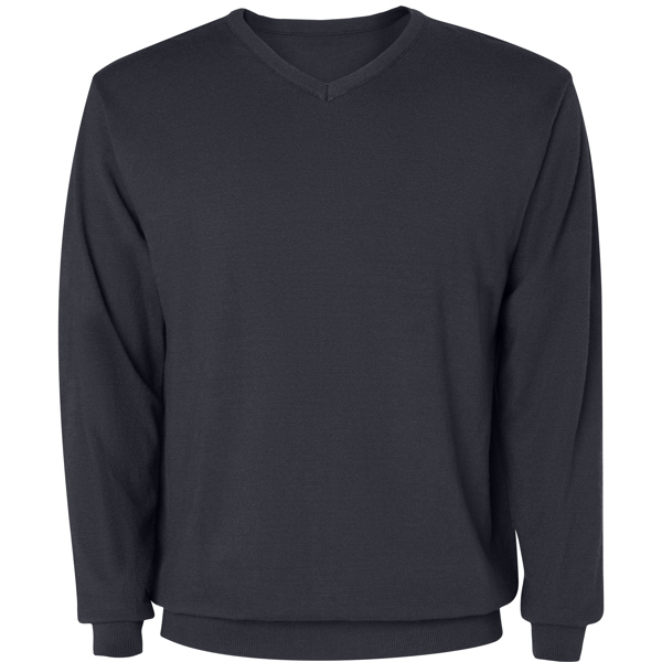 Maglioncino da uomo a tessitura fine con scollo a V. Collo, polsini e orlo a costine tono su tono 1x1.